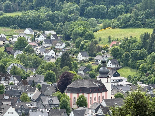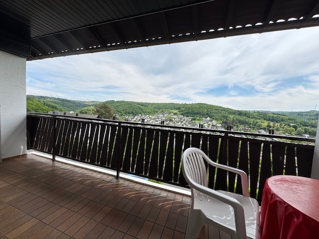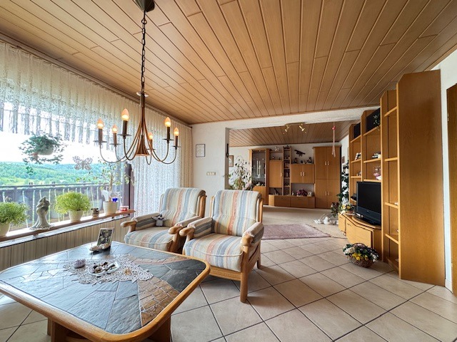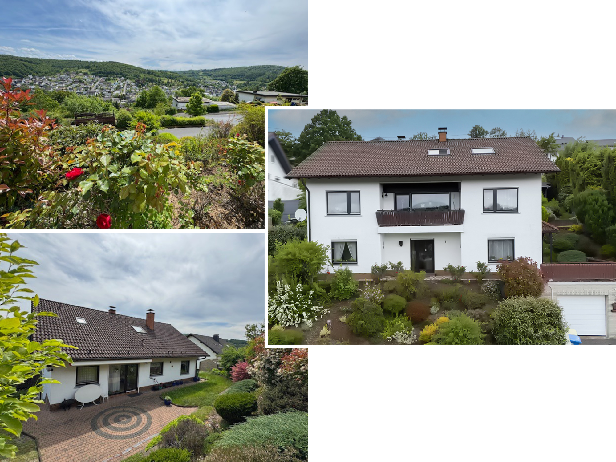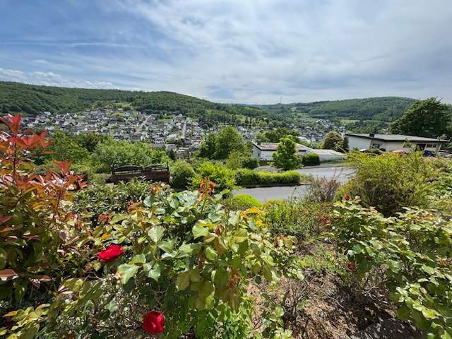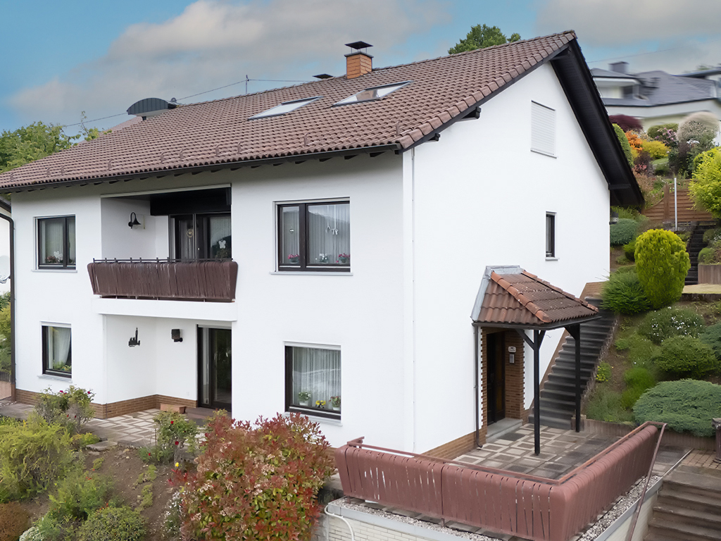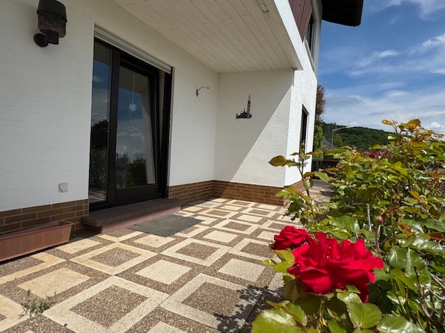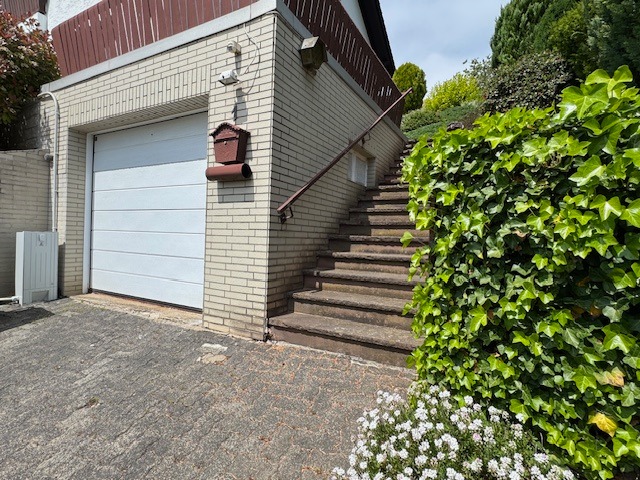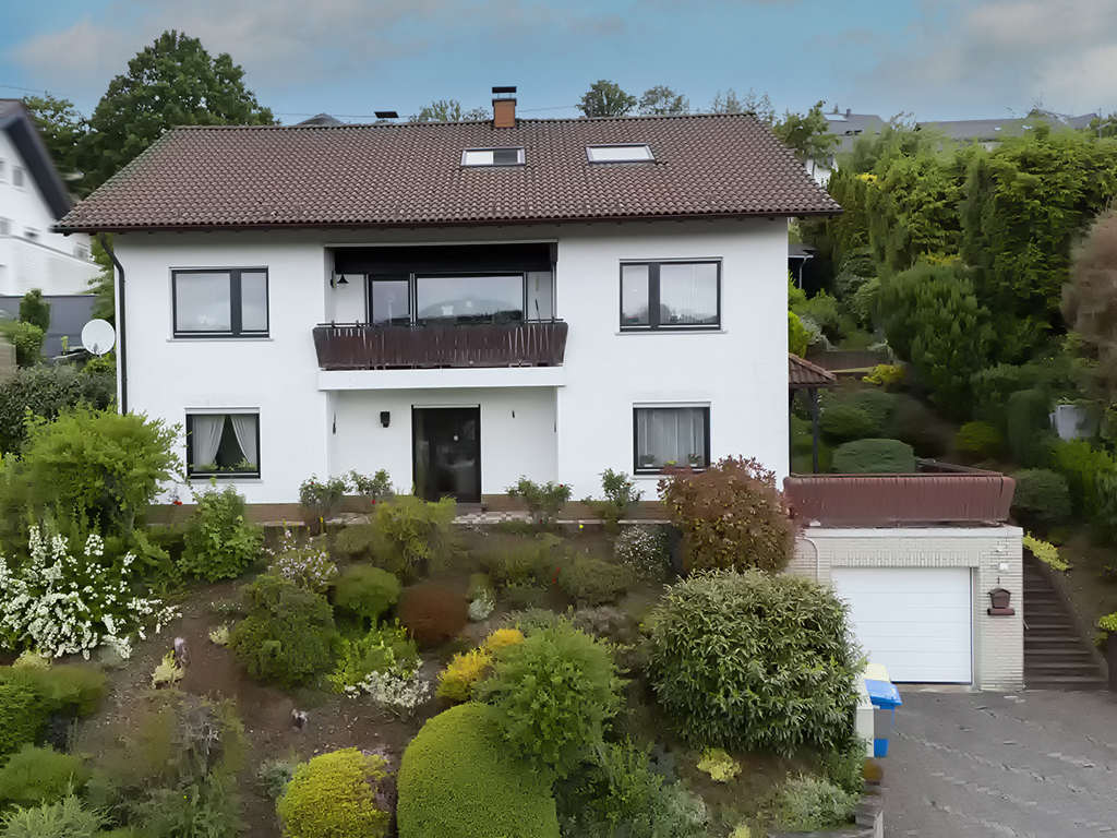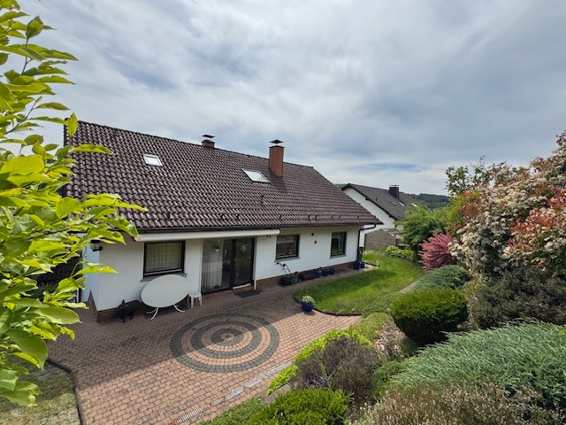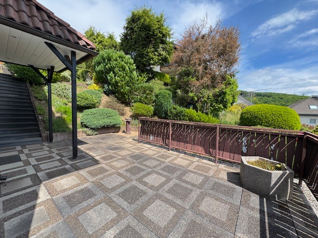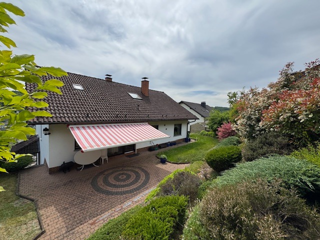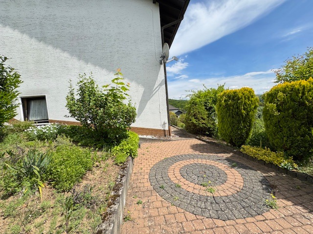Das Anwesen befindet sich in sonniger und ruhiger Südhanglage und bietet eine unverbaubare Fernsicht. Das Areal ist terrassenförmig angelegt, vielfältig bepflanzt, und teilweise mit Rasen eingesät. Die Zuwege sind mit Verbundsteinen gepflastert; die Terrassen vorm und hinterm Haus (mit elektrischer Markise) sind plattiert bzw. ebenso gepflastert. Der Wald mit schönen Wanderwegen, Skihang und Hallenbad befinden sich in naher Umgebung, ebenso die Realschule plus.
