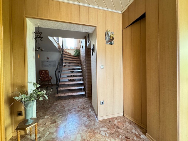 Das Wohnhaus wurde ca. 1974 in Massivbauweise errichtet und ist von außen verputzt. Das Satteldach ist mit Pfannen eingedeckt. Die Beheizung erfolgt über eine Ölzentralheizung; ein vorhandener Kaminofen ist außer Betrieb. Fenster in Holz mit Isolierverglasung und Rollläden, im Obergeschoss mit elektrischem Antrieb. Bodenbeläge in Marmor, Fliesen und Teppichboden; Innentreppe in Marmor. Das Haus verfügt über 3 Bäder.
