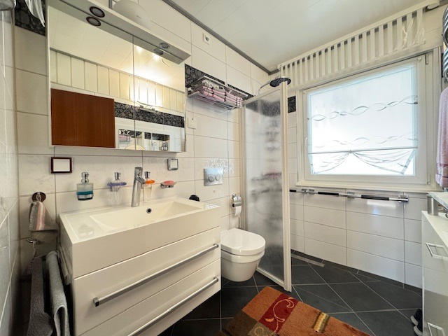 Im Laufe der Jahre fanden noch diverse Modernisierungsmaßnahmen statt: neue Kunststofffenster mit Isolierverglasung im Erdgeschoss (2005-2008), elektrische Rollläden im Dachgeschoss, 2016 wurde das Bad im Erdgeschoss erneuert mit einer ebenerdigen Dusche. Das Haus verfügt über insgesamt 3 Bäder.