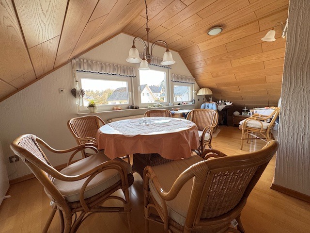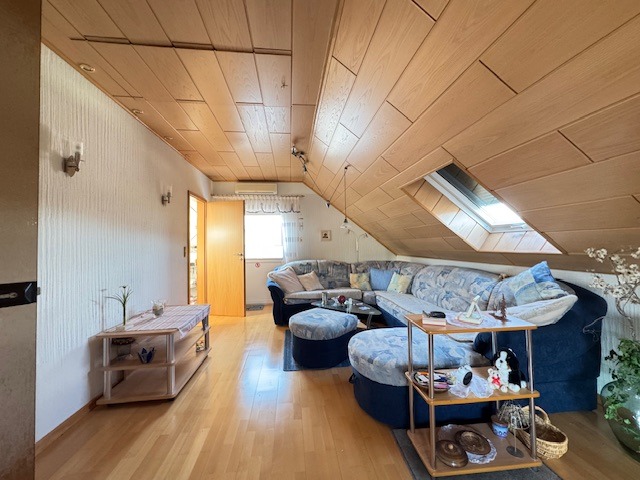 Das gepflegte, gemütliche Wohnhaus wurde 1977 als Streif-Fertighaus auf einem massiven Keller errichtet. Der Ausbau des Dachgeschosses zu Wohnzwecken (als Apartment) erfolgte im Jahr 2001. Das Satteldach ist mit Pfannen eingedeckt. Die Beheizung erfolgt über eine Ölzentralheizung; alternativ dazu sind Infrarotheizkörper vorhanden, und im Dachgeschoss ist eine Klimaanlage installiert (zum Kühlen und Heizen).