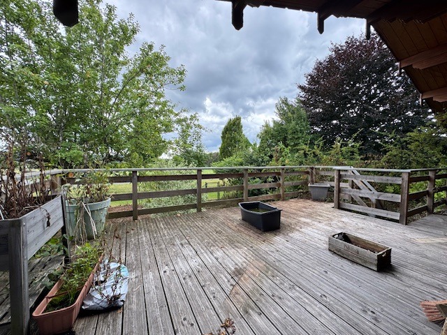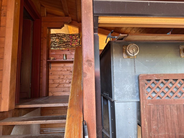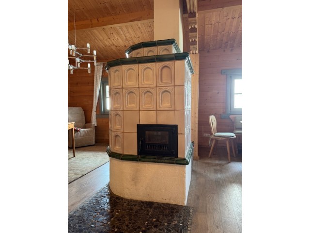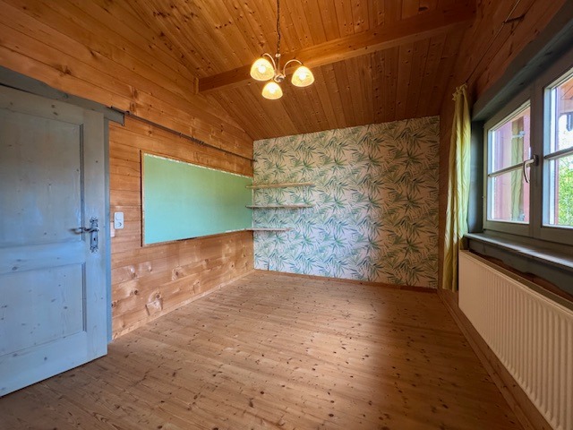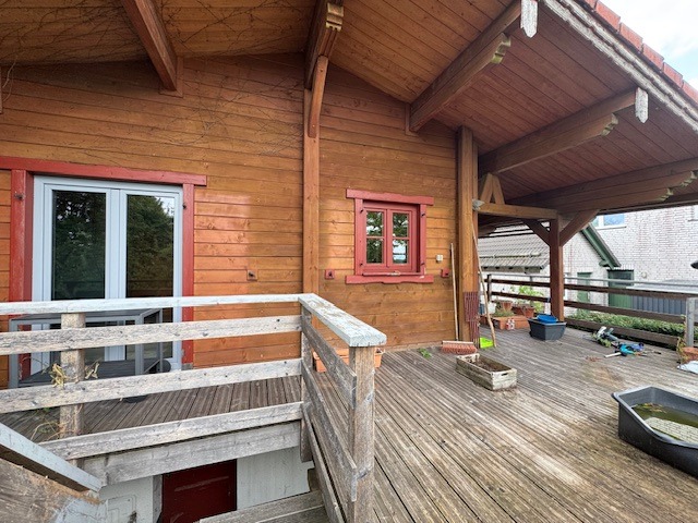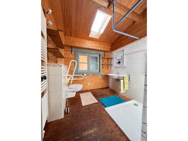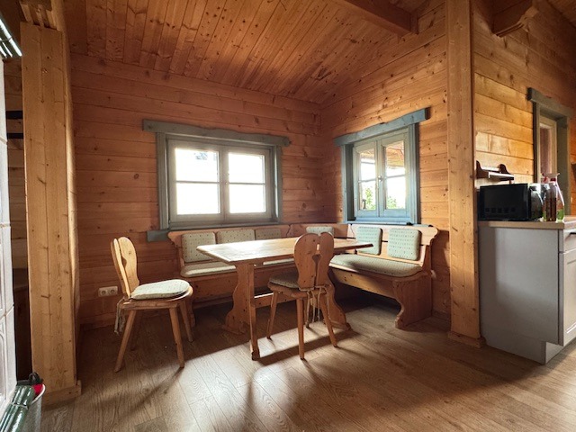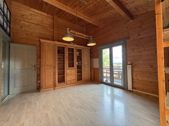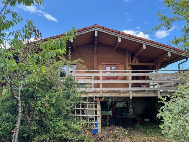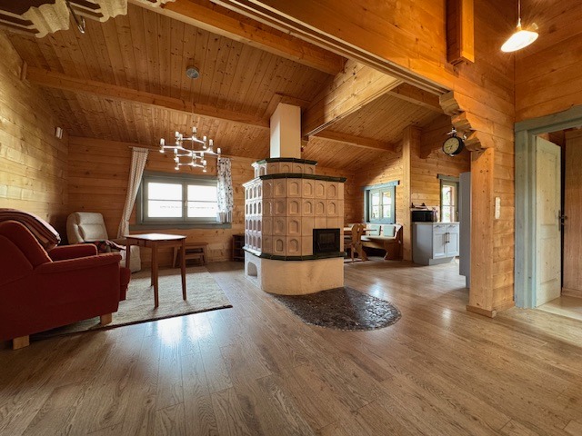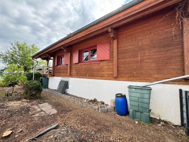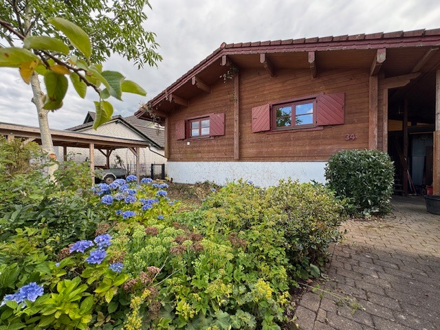 Das Wohnhaus wurde 1998 in Holzbauweise (Blockbohlen) errichtet und im Jahr 2000 um einen Anbau/Wintergarten erweitert. Der Keller (Raumhöhe ca. 1,75 m) ist massiv gebaut, das Satteldach mit Pfannen eingedeckt. Die Beheizung erfolgt über einen Kachelofen (im Wohnbereich) sowie einen Pelletofen (von 2012 / im Wintergarten); für die Warmwasserversorgung ist eine Solaranlage auf dem Dach installiert. Fenster in Holz mit Isolierverglasung und tlw. Schlagläden, im Wintergarten elektrische Rollläden. Bodenbeläge in Laminat und Holzböden. Zur weiteren Ausstattung gehört ein tlw. überdachter Balkon.