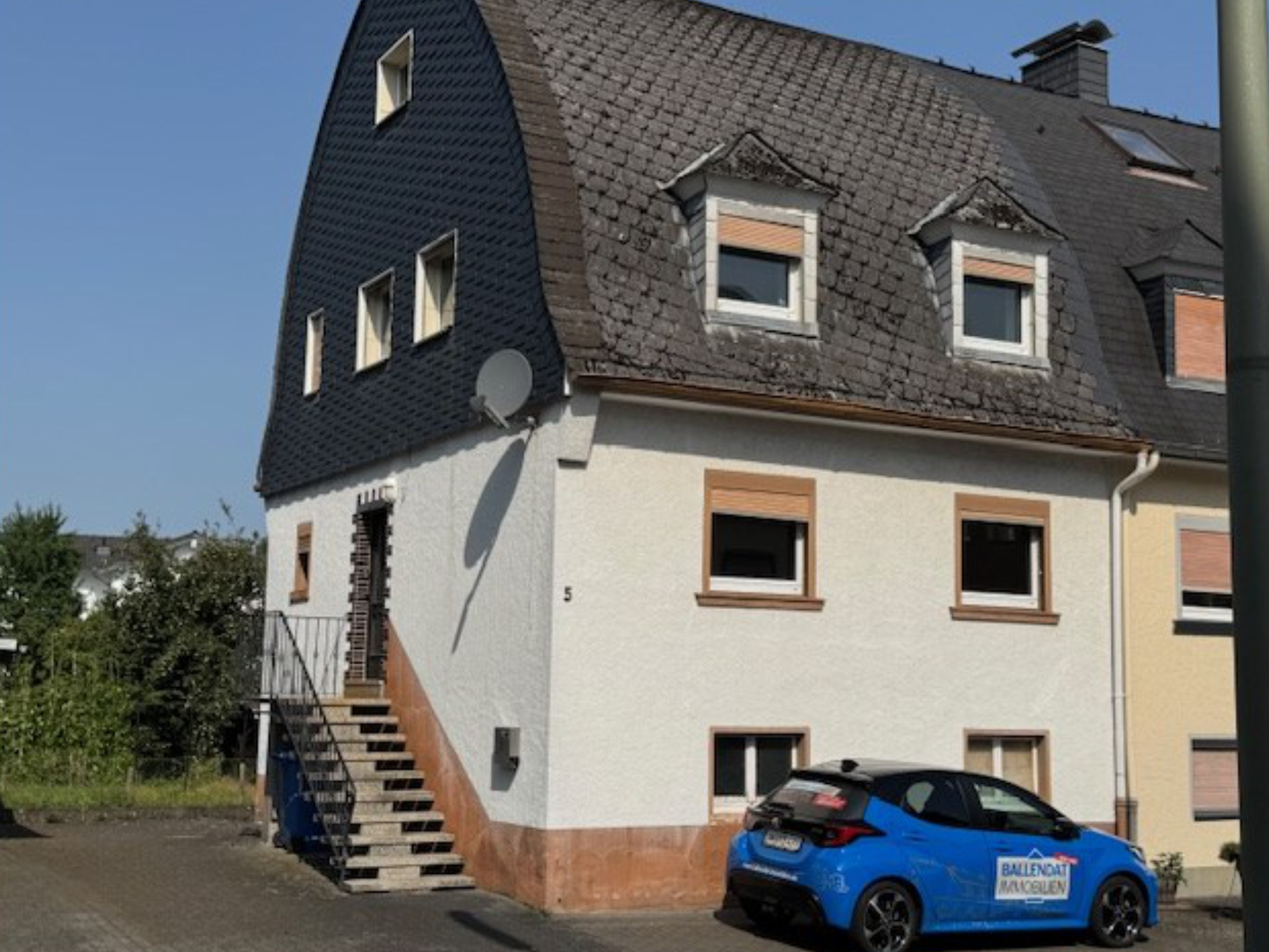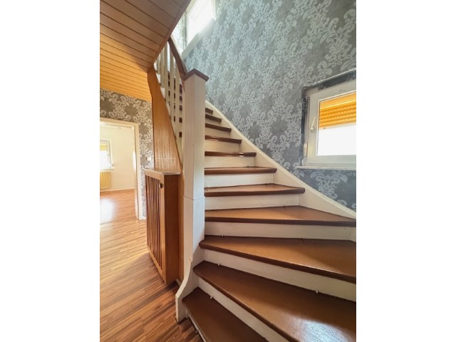 Bei dem Wohnhaus handelt es sich um eine Doppelhaushälfte, die ca. 1929 in Massivbauweise errichtet wurde. Die Giebelseite ist teilweise mit Naturschiefer verkleidet, ansonsten ist die Fassade verputzt. Das Dach verfügt über vier Gauben und ist mit Kunstschiefer eingedeckt. Die Beheizung erfolgt über eine Ölzentralheizung (von 2009); es sind zwei Kaminzüge vorhanden. Die Fenster in den beiden Wohnetagen sind in Kunststoff mit Isolierverglasung und Rollläden; Bodenbeläge in Laminat und PVC.