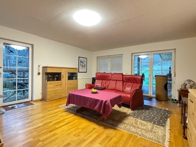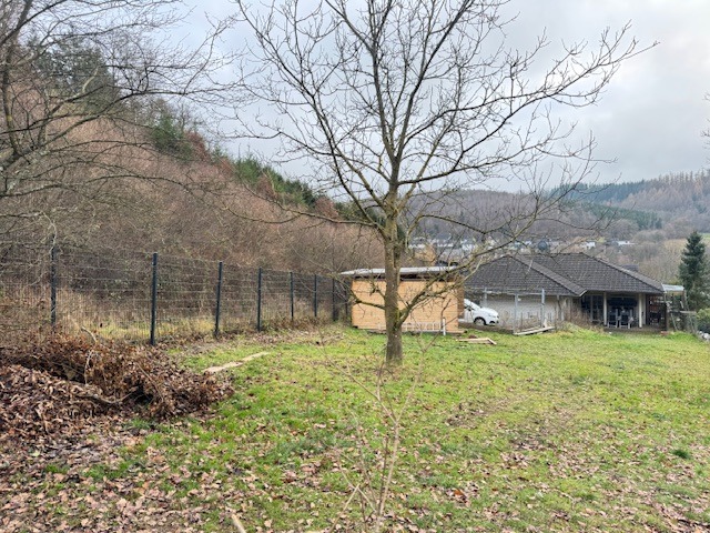 Das Grundstück befindet sich in ruhiger, sonniger Ortsrandlage ohne Durchgangsverkehr. Zum nahe gelegenen Wald sind es nur wenige Meter. Das Areal ist eingezäunt, als Wiese angelegt, und die Zuwegung mit Verbundsteinen gepflastert. Es sind 4 PKW-Stellplätze vorhanden.