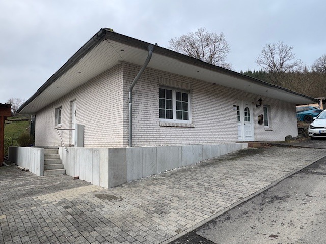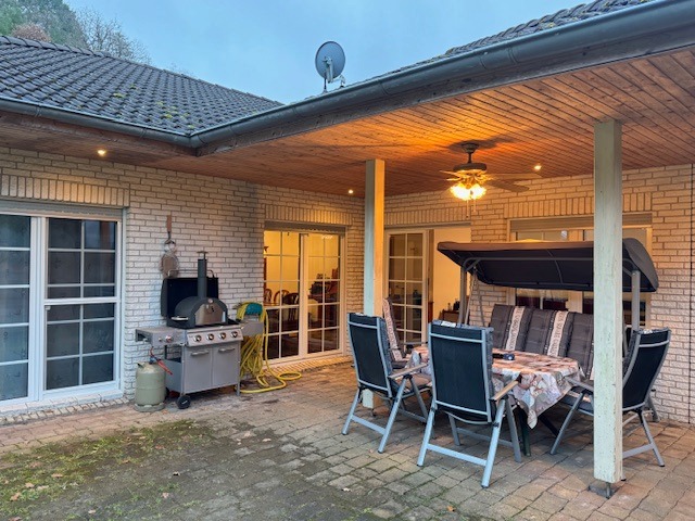 Der schicke, energiesparsame Winkelbungalow (Energieeffizienzklasse C) wurde 2001 in Massivbauweise mit Fertigbauteilen errichtet und die Außenfassade mit einer Verklinkerung versehen. Das Walmdach ist mit Frankfurter Pfannen eingedeckt. Die Beheizung erfolgt über eine Gasheizung. Fenster in Kunststoff mit Sprossen innerhalb der Isolierverglasung und Rollläden; Bodenbeläge in Fliesen, Parkett und Kork. Das Haus ist mit einem Duschbad/WC sowie einem Hauptbad mit Wanne/WC ausgestattet. Ein weiterer Vorteil: Sowohl vom Wohn- und Esszimmer als auch vom Schlafzimmer gibt es einen direkten Zugang zur überdachten Terrasse.