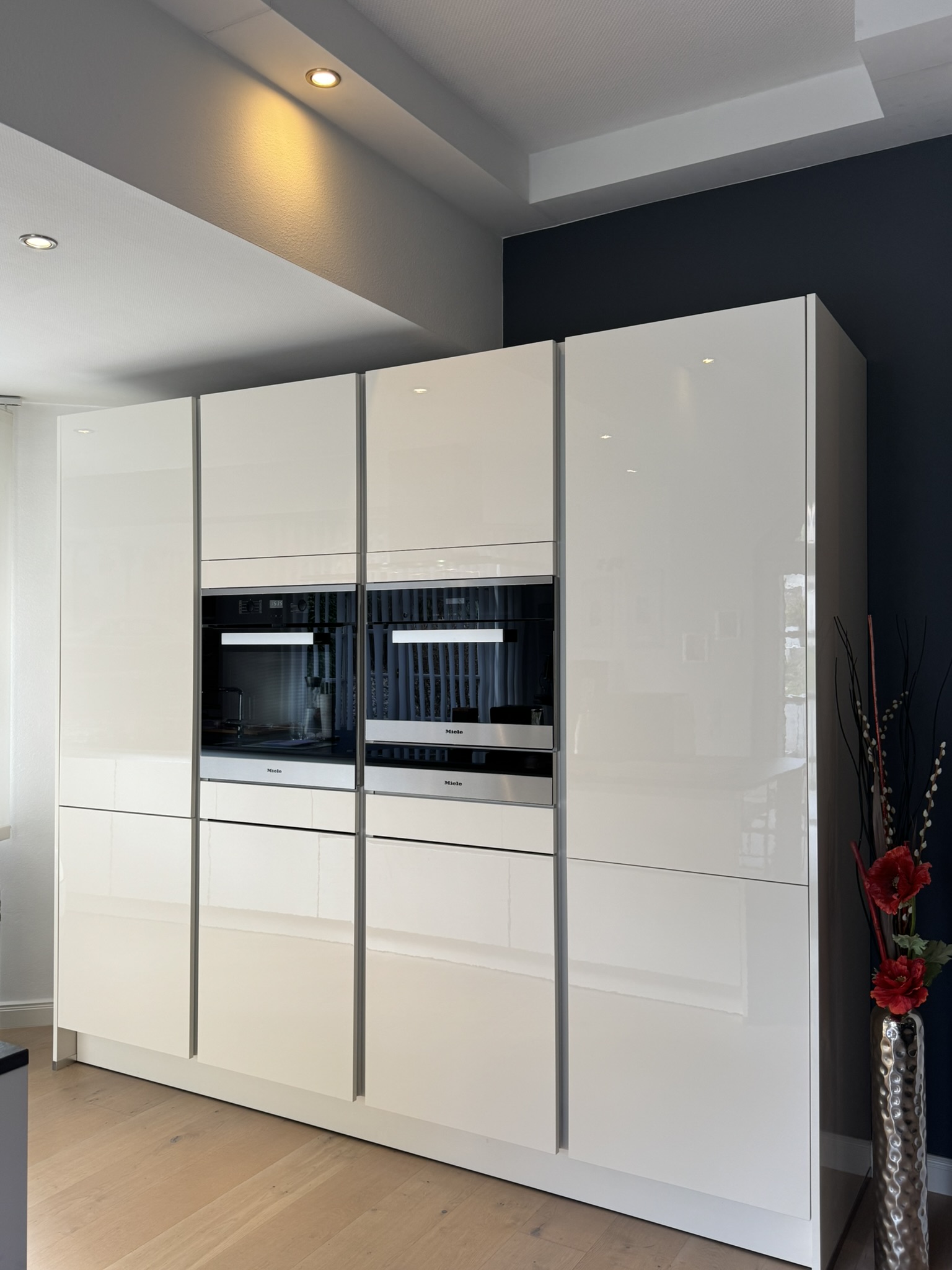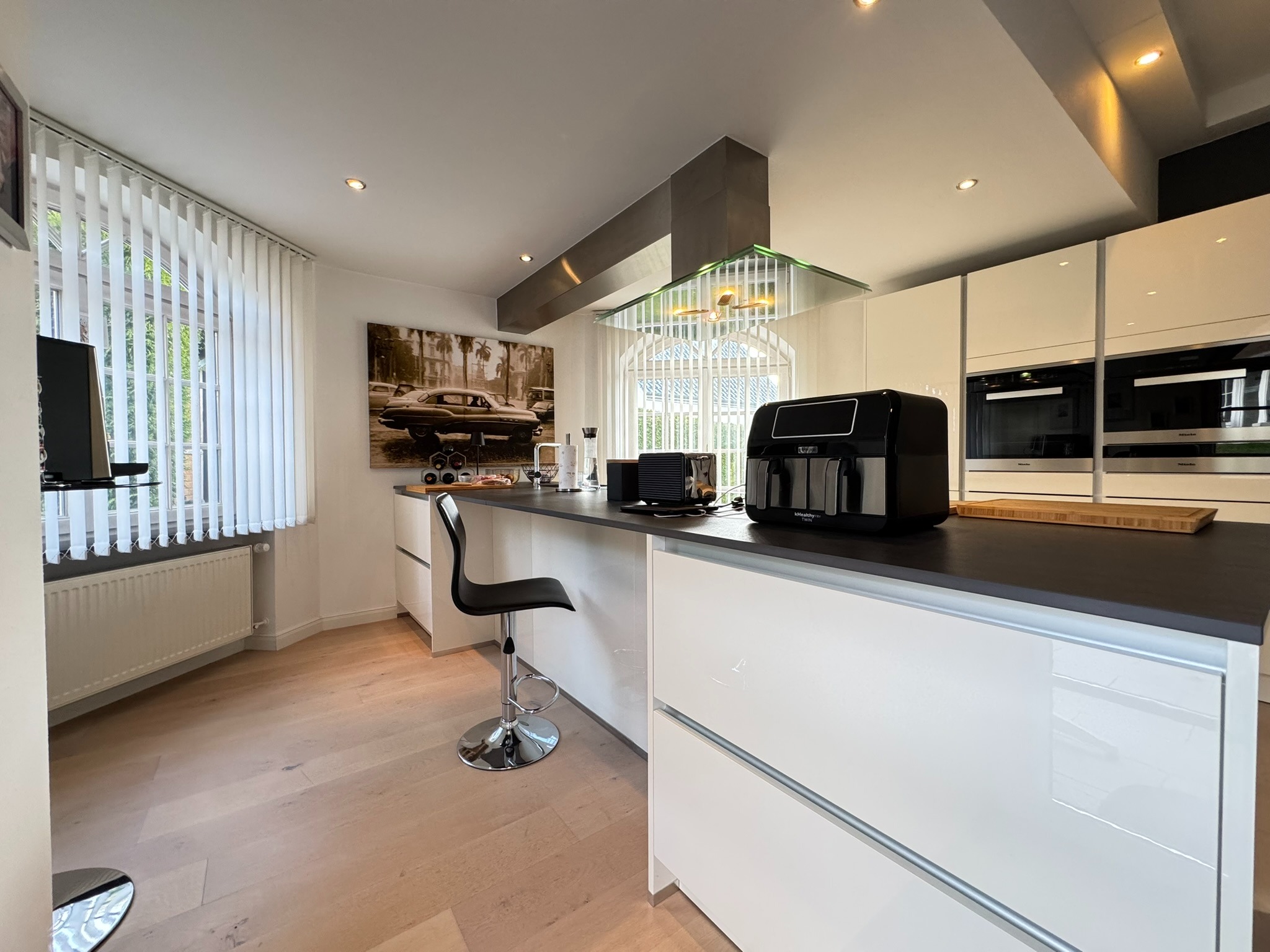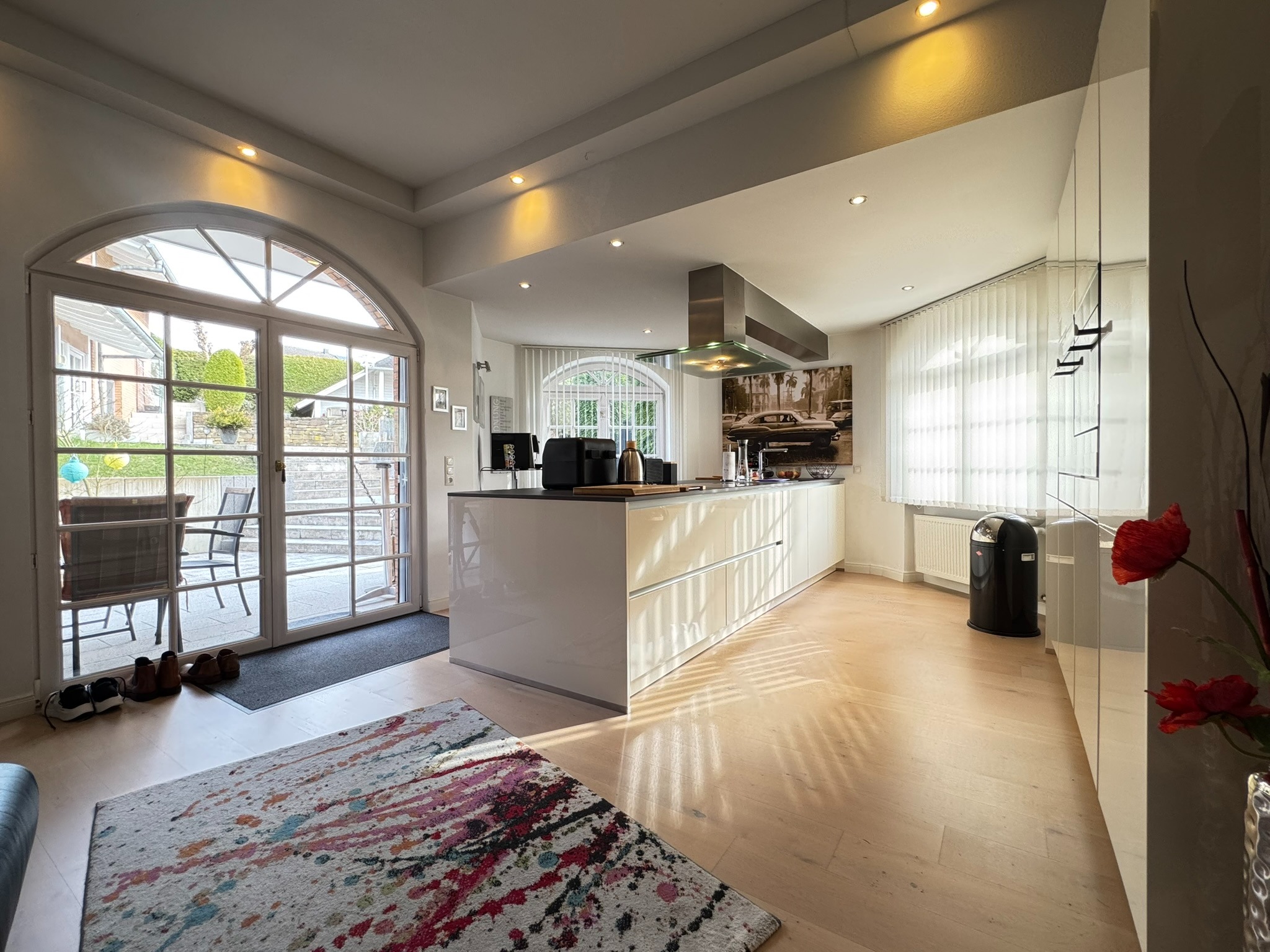 Eine exklusive Einbauküche (von 2020) mit einer Kochinsel und hochwertigen Elektrogeräten ist im Kaufpreis enthalten.
