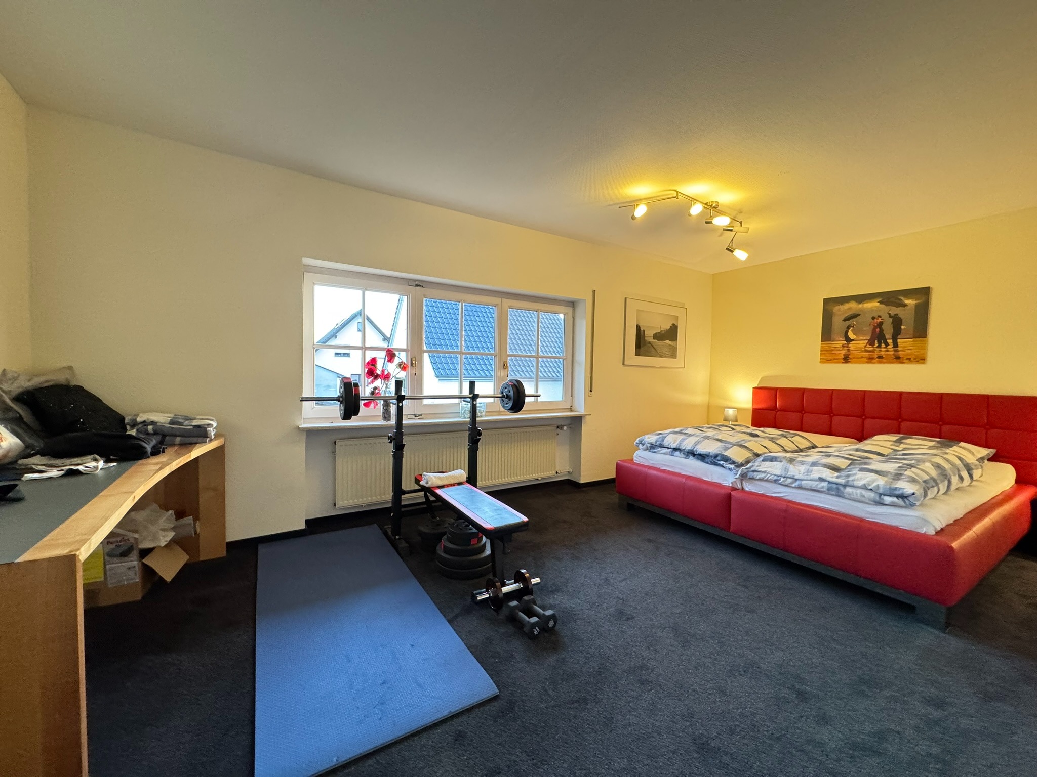 OG: Flur, 3 Schlafzimmer (1x mit begehbarem Kleiderschrank), Ankleide-/Gästezimmer, Bad mit Wanne/WC, Duschbad mit Dampfsauna und WC, überdachter Balkon;