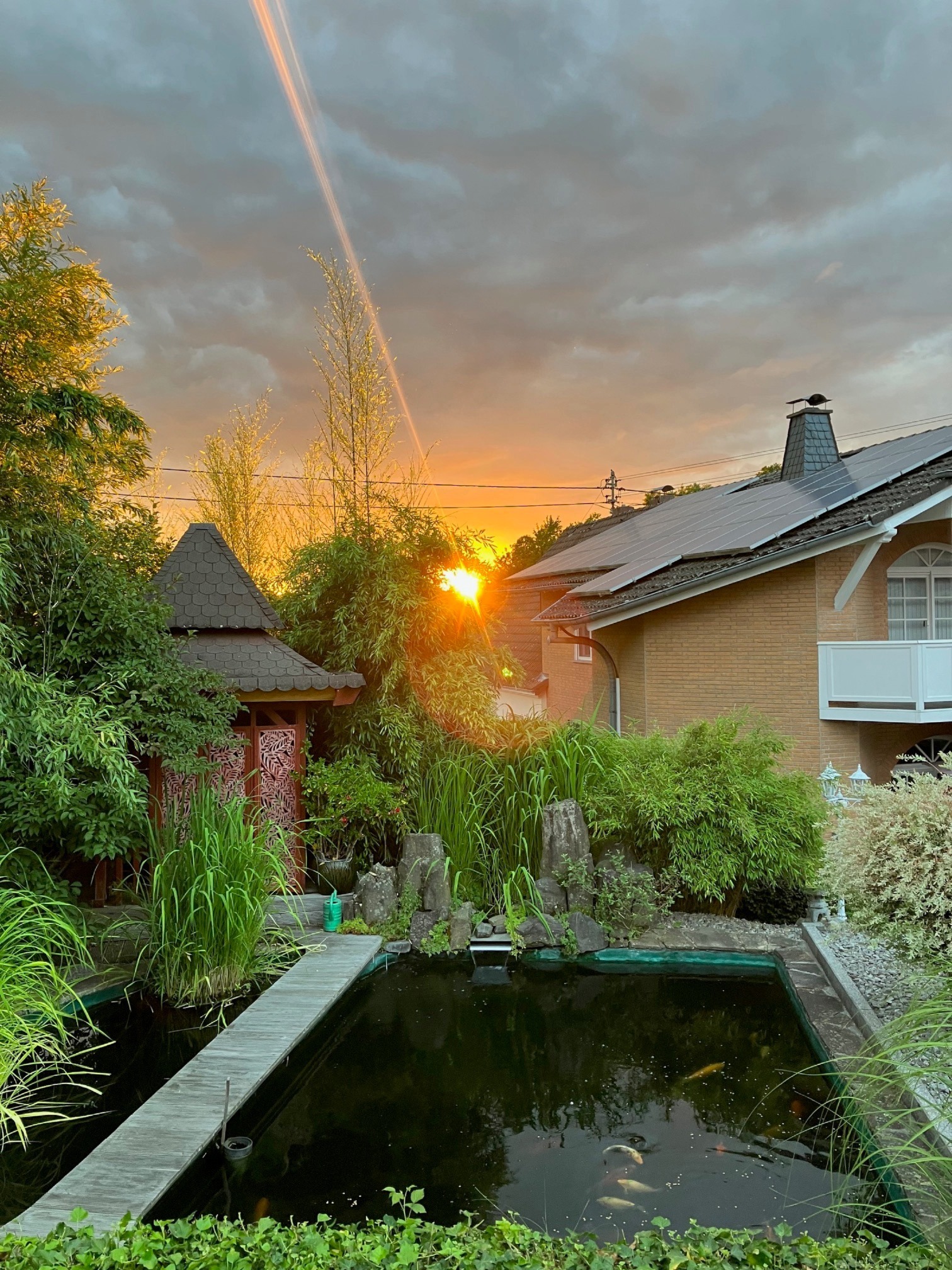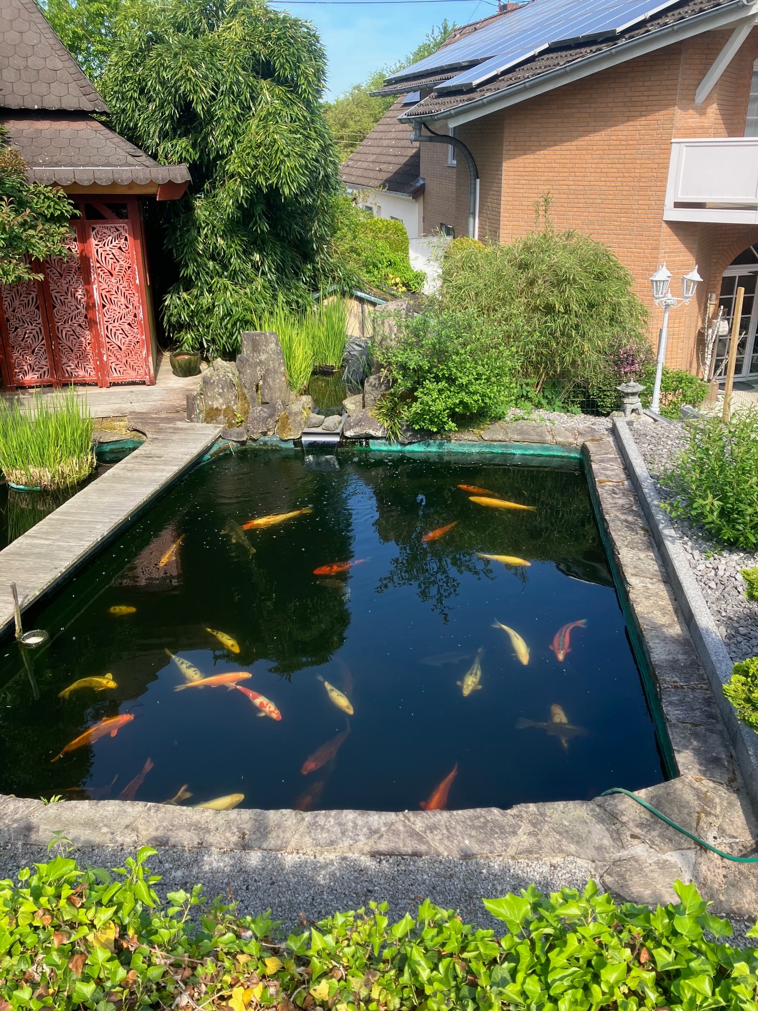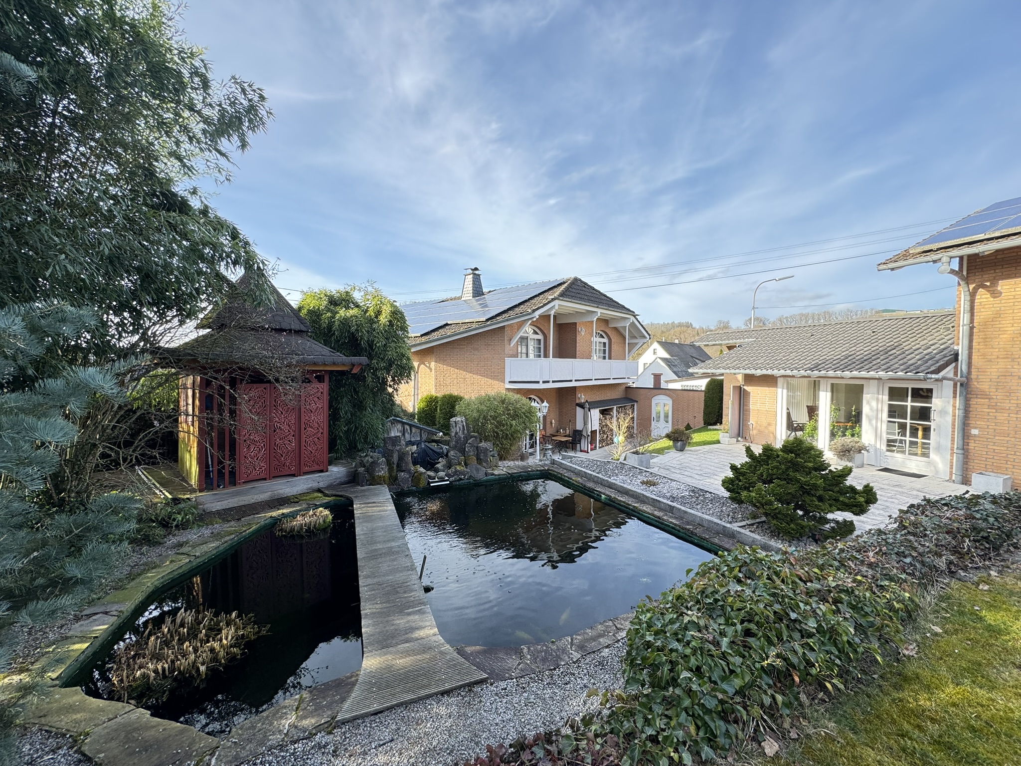 Das tolle Anwesen ist mit einer Hecke eingefriedet und von der Straße her nicht einsehbar. Es ist gärtnerisch sehr geschmackvoll angelegt - Rasenfläche mit vielfältiger Bepflanzung, eine große Teichanlage mit Steg, 2 Terrassen, Außenbeleuchtung, Zuwege und Kfz-Stellplatz sind mit Verbundsteinen gepflastert.